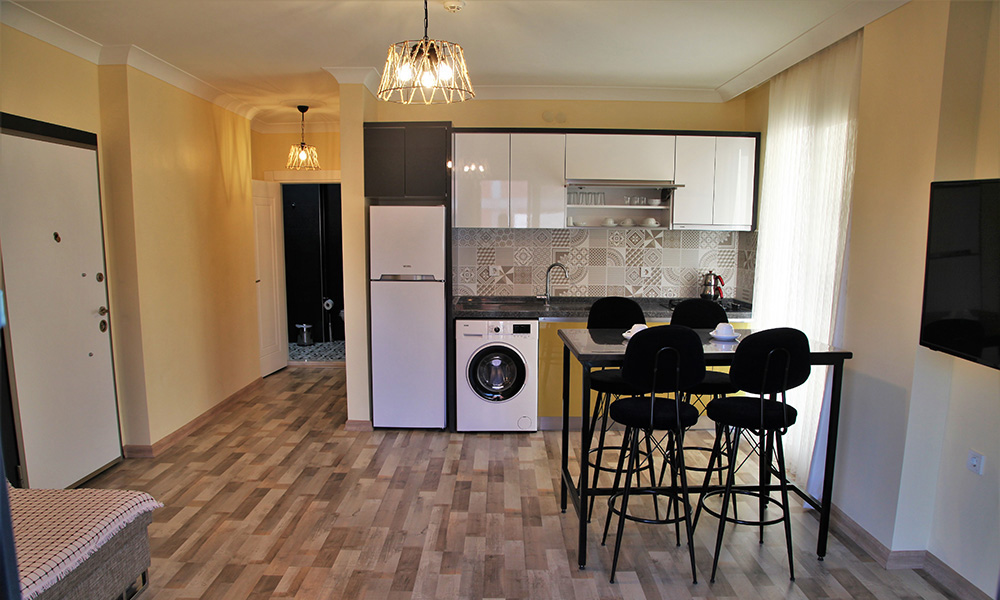 Yatak Odası ve Oturma Salonu olmak üzere 2 bölümden oluşmaktadır. Altınkum Plajına sadece 250 metre mesafededir. Salonunun bir bölümü mutfak şeklinde düzenlenmiştir. Mobilya olarak; 1 adet çift kişilik yatak, giysi dolabı, yemek masa-sandalye takımı ile birlikte 1 adet 3 kişilik, 1 adet tek kişilik berjer koltuk mevcuttur. Gerektiğinde üç kişilik koltukların (süryat) oldukça konforlu bir yatak olarak da kullanılmasıyla toplamda 4 kişilik konaklama/tatil imkanı sunmaktadır. Çamaşır Makinası, Wi-Fi, Banyo, Lavabo, WC, 43" TV, Klima, Buzdolabı, Mutfakta her türlü mutfak eşyası (Çatal, Bıçak, Tencere, Tava, Açacak vb.) ve Ocak bulunmaktadır. Bu dairemiz, geniş çimli bahçe kullanım imkanına sahiptir.